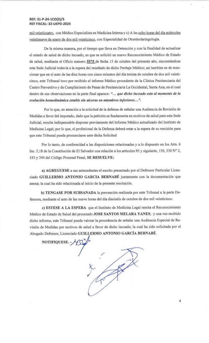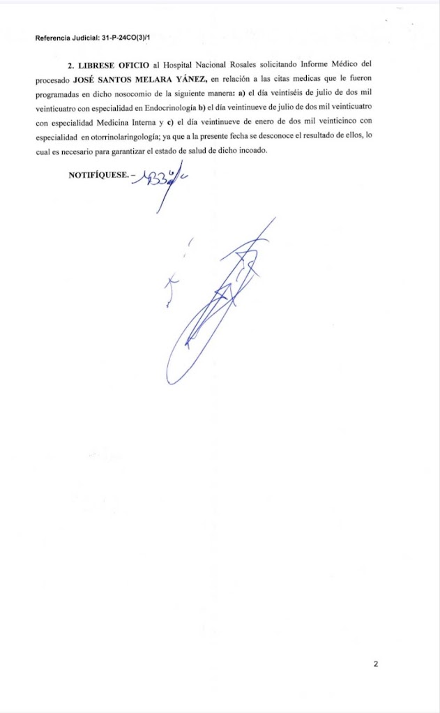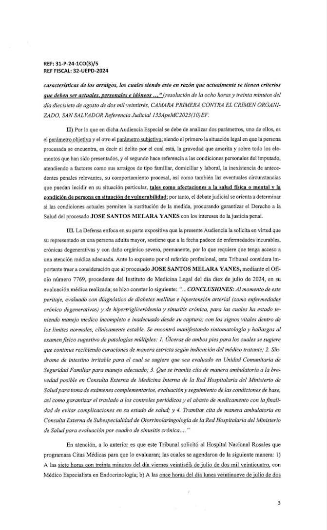 Mi fuente en la fiscalía me dijo: “Tal vez simplemente esperan que Santas Melara no sobreviva los 6 meses más en la cárcel.” Lamentablemente, esto es un peligro real. Hay informes médicos, también bajo estricta reserva, que indican que vos tenés enfermedades crónicas que no están siendo atendidas debidamente. Entre los documentos que me facilitó mi fuente en la fiscalía hay un informe que indica que fuiste ingresado al Hospital San Juan de Dios de Santa Ana el 23 de octubre. Se cita el informe del Hospital San Juan: “Diagnóstico: síndrome de Colon irritado; Diabetes Mellitus Nr. 2; Hipertensión esencial...” Y se agrega que el paciente no fue hospitalizado sino retirado sin tratamiento.