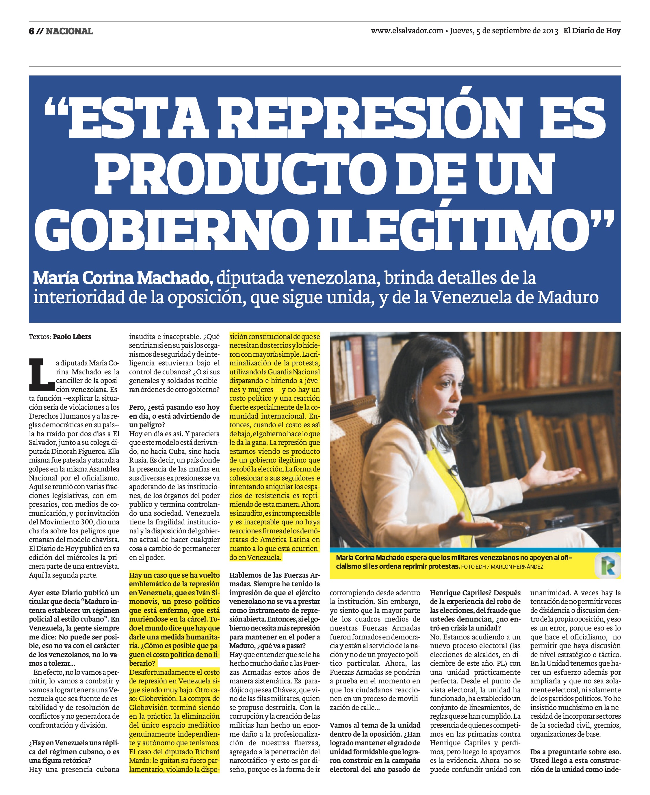 La diputada María Corina Machado es la canciller de la oposición venezolana. Esta función –explicar la situación seria de violaciones a los Derechos Humanos y a las reglas democráticas en su país- la ha llevado por dos días a El Salvador, junto a su colega diputada Dinorah Figueroa. Se reunió con varias fracciones legislativas, con empresarios, con medios de comunicación, y a invitación del movimiento 300 dio una charla sobre los peligros que emanan del modelo chavista. El Diario de Hoy publicó en su edición de miércoles la primera parte de una entrevista que María Corina Machado nos brindó. Aquí la segunda parte.